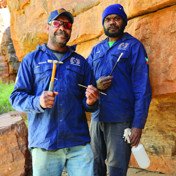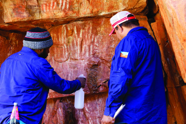 Kelvin Kopp and Joe Palmer sprayed turpentine to clear mud off the rock art.